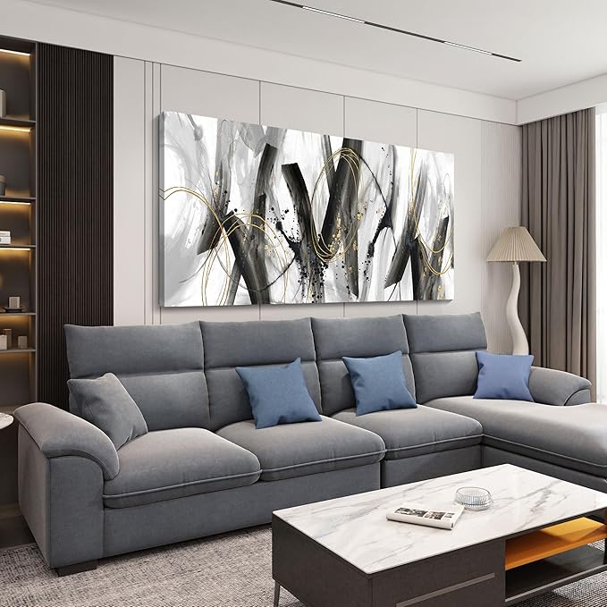 Large Modern Wall Art for Living Room, Bedroom, Office - Black and Gold Wall Pictures Abstract Paintings, Artwork - Black and White Wall Decor, Grey Tone29×58IN