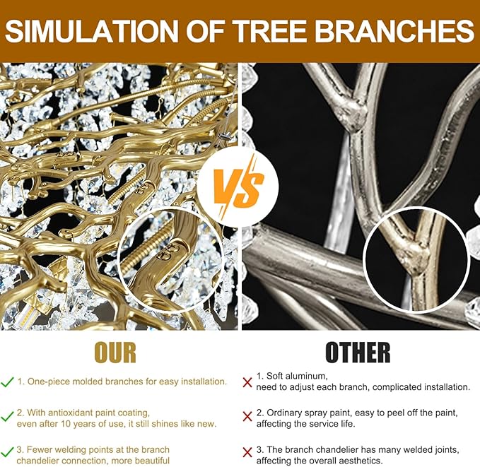 - 【Modern Crystal Chandelier】Transform your living space into a captivating masterpiece with our elegant crystal tree branches chandelier. This stunning chandelier is designed to impress, featuring a unique tree branch-inspired design adorned with glistening crystals that cast a mesmerizing play of light and shadow.