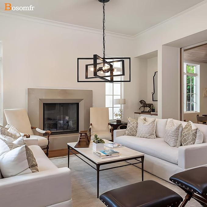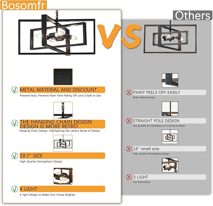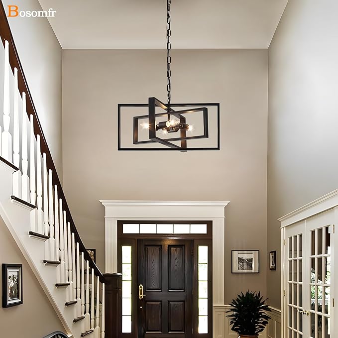 - HIGH QUALITY:Bosomfr Chandeliers for Dining Room, is made of high-quality materials and is strong and durable, making it hassle-free for your family to use.Add a touch of rustic charm and industrial style to any space with our farmhouse chandelier. This exquisite 4-light pendant fixture features a durable metal frame in a sleek black finish, Brushed Nickel metal frame gives this metal chandelier a timeless and sophisticated look, perfect for adding a modern touch to your home decor.