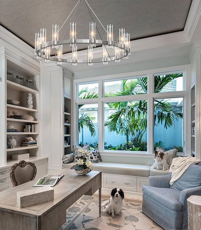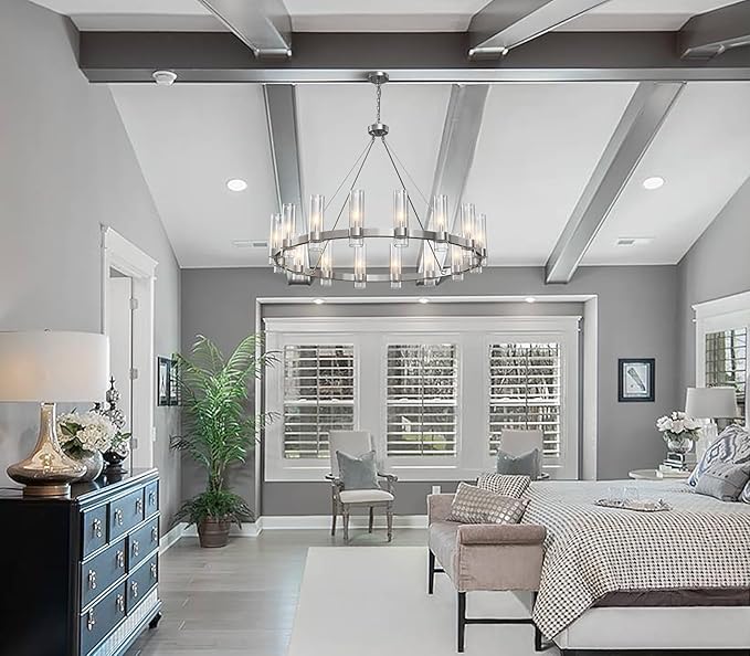 Modern Chandelier,Wagon 16-Lights Wheel Chandelier with Glass Shade, Nickel 48 Inch Large Round Industrial High Ceilings Pendant Lighting Fixture for Dining Room, Living Room, Foyer