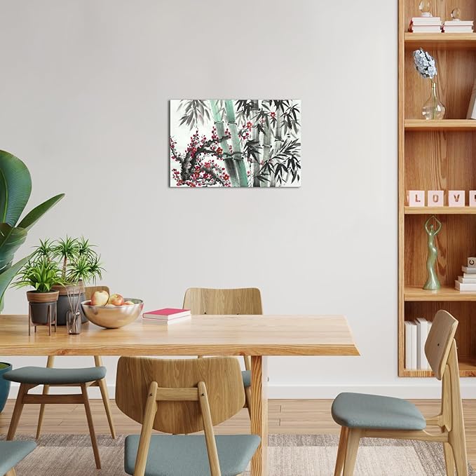 Canvbay Traditional Chinese Ink Canvas Wall Art Asian Bamboo and Red Plum Blossom Painting Pictures for Home Decor Living Room Bedroom 16x24inch
