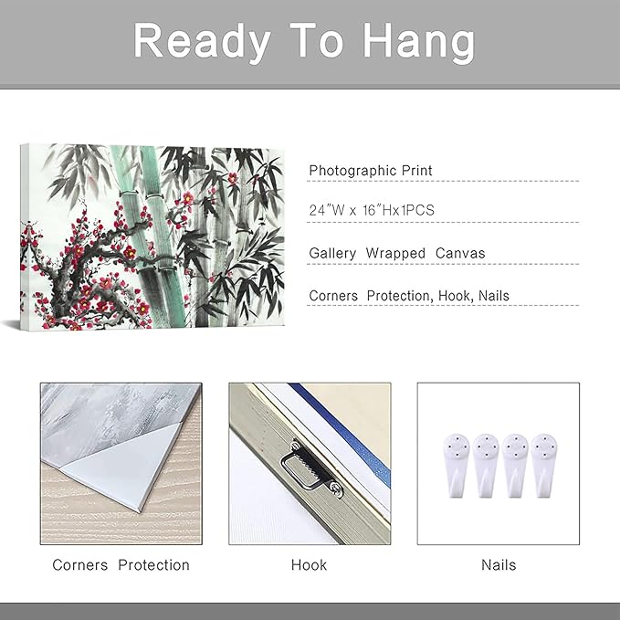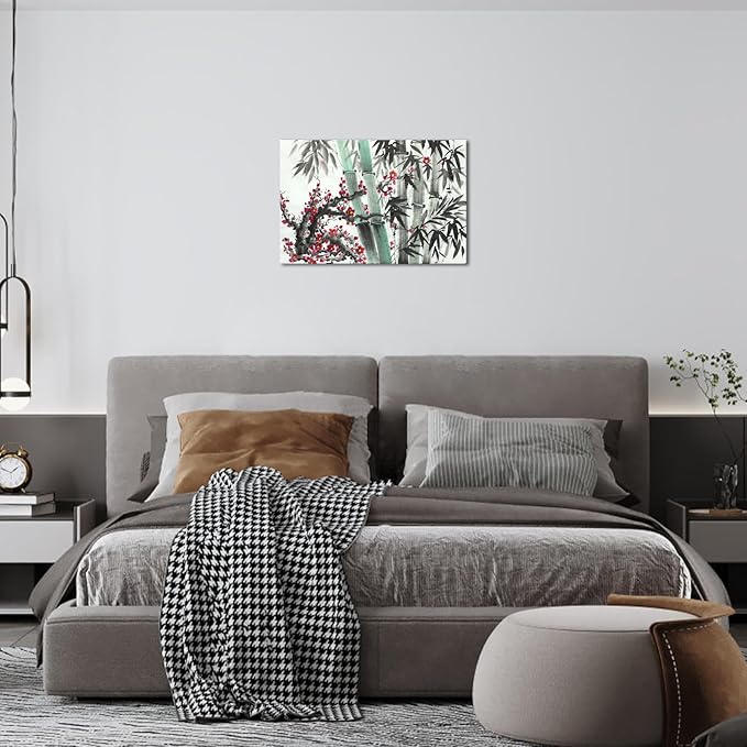 Canvbay Asian Canvas Wall Art Traditional Chinese Ink Style with Bamboo and Red Plum Blossom Painting Pictures Oriental Flower Print Poster Framed for Home Decor Living Room Bedroom 24x36inch