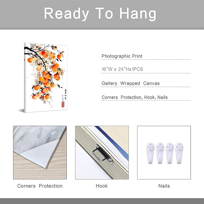 Canvbay Asian Wall Art Traditional Chinese Ink Style with 'May everything go as you wish' Quote Canvas Prints Persimmon on Branch Painting Pictures Oriental Poster Framed for Home Decor 16x24inch