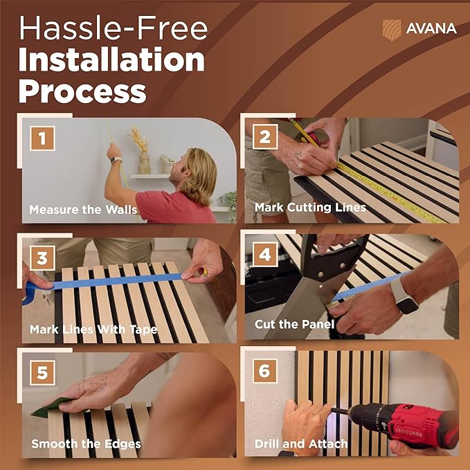 - Effortless Installation — Simplify your journey to acoustic excellence with Avana panels wall decor. Enjoy the convenience of quick and easy installation of wood panels. Whether mounted on walls or ceilings, these wall wood panels bring instant acoustic enhancement to your space. Bid farewell to complex installation processes and embrace a hassle-free experience with Avana wall soundproofing panels that save you time, ensuring your acoustic journey begins with our wood paneling.