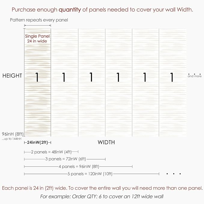 - FIT ANY SIZE: Our wallpapers are sold by the panel, and all panels of wallpaper are custom printed. Each panel is 24" inches wide with an additional 3/4" for an overlap. Select the HEIGHT option and panel QUANTITY based on your project WIDTH and HEIGHT measurements.