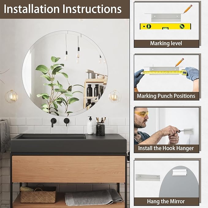- 【Safe and Easy to Install】The beveled bathroom mirror comes with installation accessories and installation instructions. You only need to fasten the screws to the wall to install the frameless round mirror. The beveled wall mirror surface is equipped with explosion-proof film, making it safe and convenient to install. The frameless vanity mirror can be hung vertically and horizontally, allowing you to easily personalize the installation to suit your space and preferences.