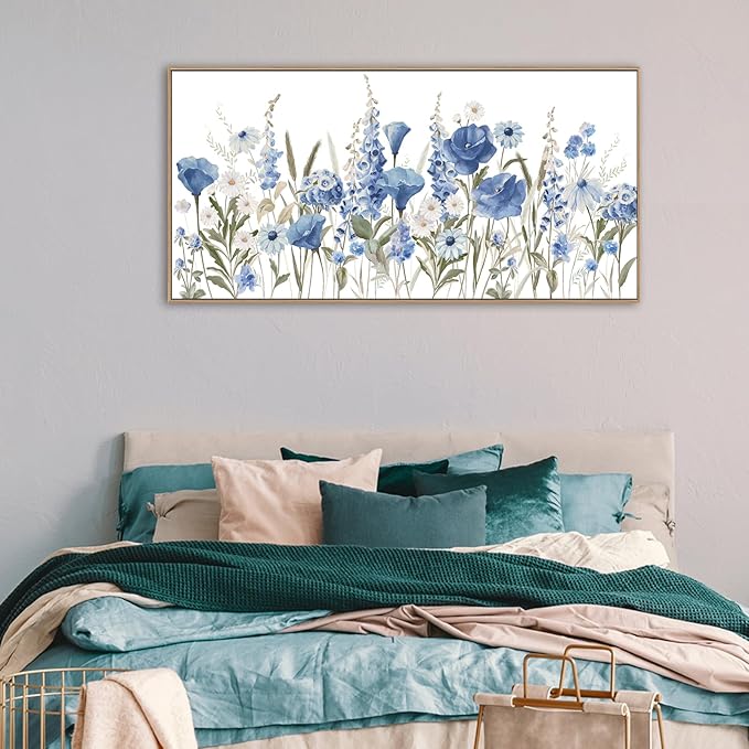 arteWOODS Elegant Flowers Framed Wall Art - Blue White Botanical Pictures for Wall Decor Floral Blossom Canvas Painting Print Artwork for Living Room Bedroom Home Office Wall Decoration 24" x 48"