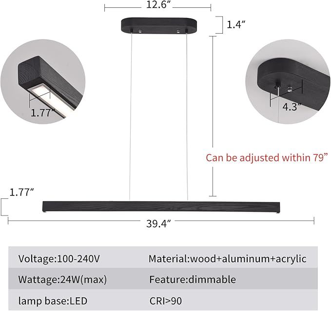 - 【Dimensions】This LED pendant kitchen island lights Color:black,size:39"(L)*1.7"(W)*1.7"(H), Wattage: 24W.Lumens:2100.color temperature:3000K/6000K/4000K CRI>90. Voltage: 100-240V.the mounting part:12.6 x 4.3 x 1.4 inches(l*w*h) can cover native American electrical box.the the cable length is adjustable up to 78 inches.notice:please do not use dimming switch,dimming equipment has been configured inside the light,please use ordinary wall button switch.otherwise the light fixture may flicker.