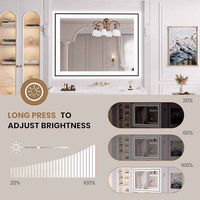 - 【Dimmable & 3 Color Temperature】: The brightness is adjustable for this lighted bathroom mirror with black frame; Simply long press the touch switch to adjust the brightness; 3 color temperature for option; warm light (3000 K); natural light (4000 K); white light (6000 K)