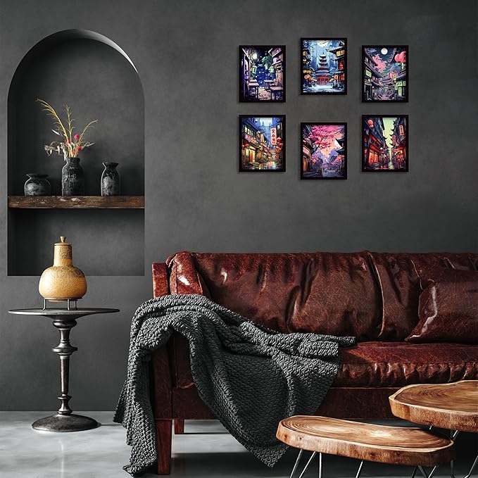 Luodroduo Japanese Wall Art Set of 6 Japan Rural Architecture Abstract Scenery Illustration Wall Decor Countryside Streets Canvas Art Poster for Living Room Bedroom Wall Art (A, 8"x10" UNFRAMED)