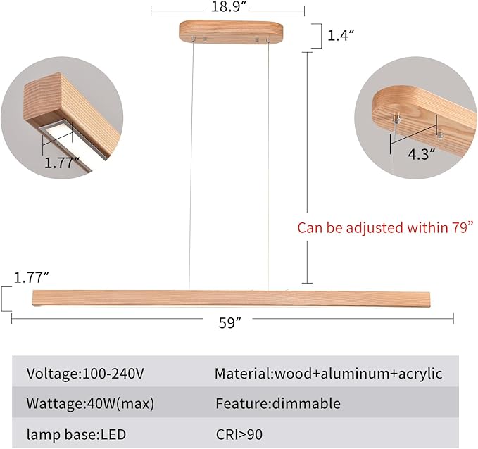 - 【Modern Minimalist Wood Linear Pendant Light】:This wood linear pendant using 100% solid wood (American ash),make life closer to nature. wooden parts:59 x 1.7x 1.7inches(l*w*h).The side view is a square design,very simple.The mounting part:18.9 x 4.3 x 1.4 inches(l*w*h) can cover USA standard electrical boxes.The maximum height of the chandelier is 78inches(Adjustable).Notice:please do not use dimming switch, dimming equipment has been configured inside the light, please use ordinary wall button switch,otherwise the light fixture may flicker.