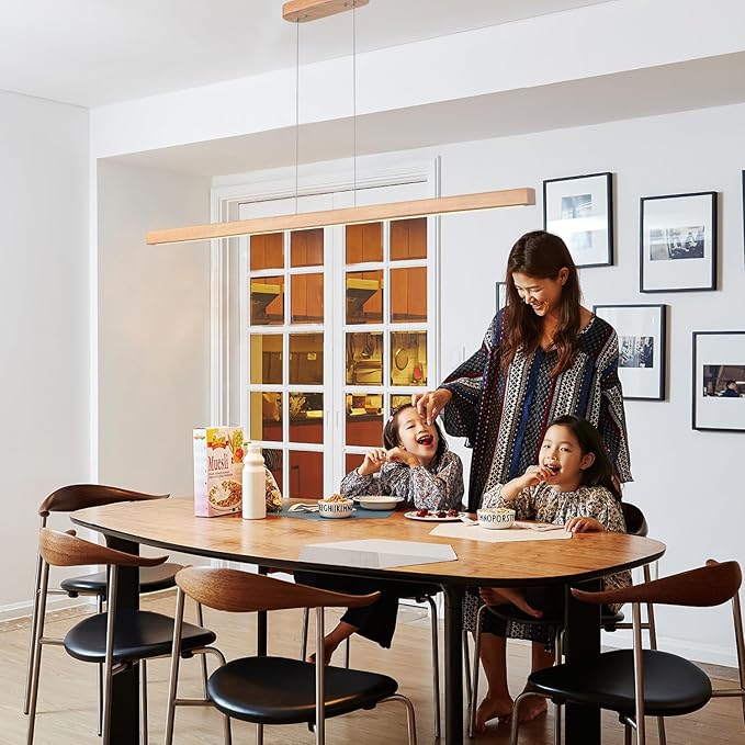 - 【Fully Dimmable Modern Pendant Light】:This modern pendant light designed with a built-in led engine.The real wood frame and acrylic shade make this fixture tailor-made for a modern design scheme.Use this hanging linear pendant light to add depth and warm light to your kitchen and dining room space. Whole 40 watt (cri>90) energy-saving led light source,high color rendering restores the true color of food, making the food on the table more delicious and more appetizing.2800 lumen,remote controls color temperature and brightness,meet your different scene lighting needs.