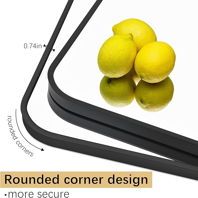 - [EXCELLENT DESIGN]: Our rounded rectangular wall mirror is designed with a kind of fashion and modern industrial style. The frame is made of brushed black metal with an angled design to protect the mirror. Besides, the black mirror is anti-stripping, anti-cracking and anti-water,and it is safer and more premium than traditional recessed frames.