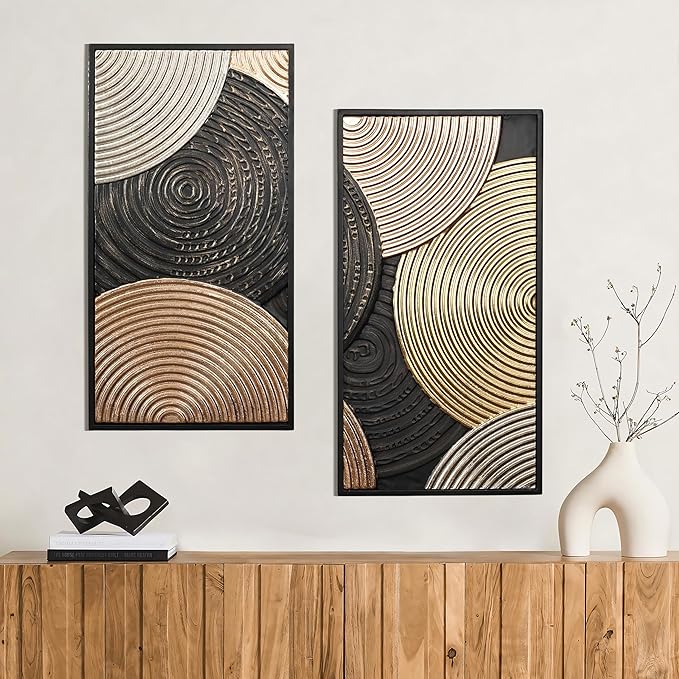 LuxenHome Set of 2 Wall Art, Modern Earth Tone Circles Abstract Rectangular Metal Wall Decor Set Luxury Handmade Wall Art Dector with Frame for Living Room, Home, Office Decorative