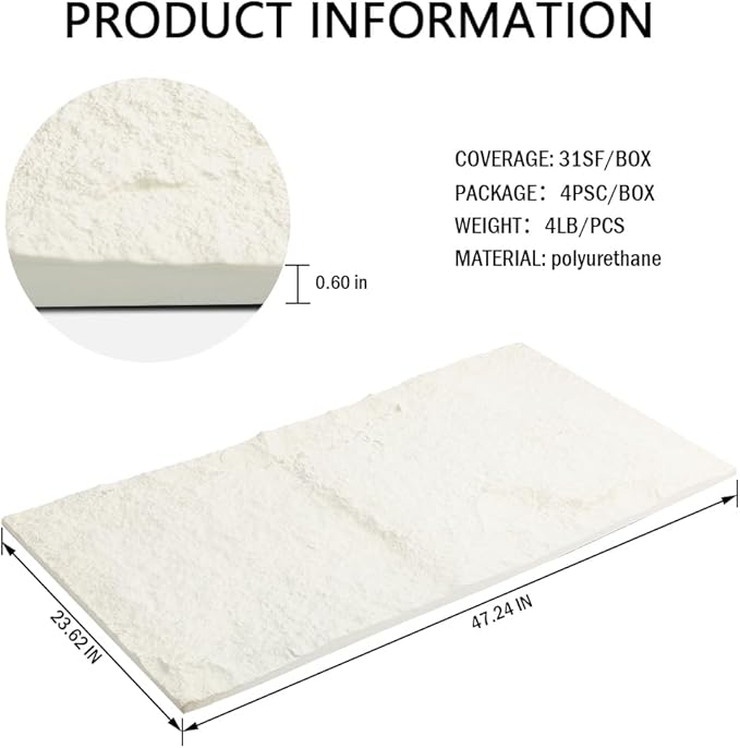- 【Specification】: Each pack includes 4 white panels, measuring 47.24*23.62 inches 0.6 - 1.18 inches each, providing a total coverage area of 31 square feet (2.88 square meter)
