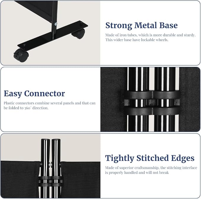 - Sturdy Iron Frame & Flexible Folding: The room divider panel is assembled from sturdy iron tubes and thick fabrics. 180gsm coated polyester fabric is thick enough to block most of the light and shadows, giving you the best privacy protection. This temporary wall divider comes with 6 lightweight panels, each panel is connected by flexible connectors so you can fold them to create different structures