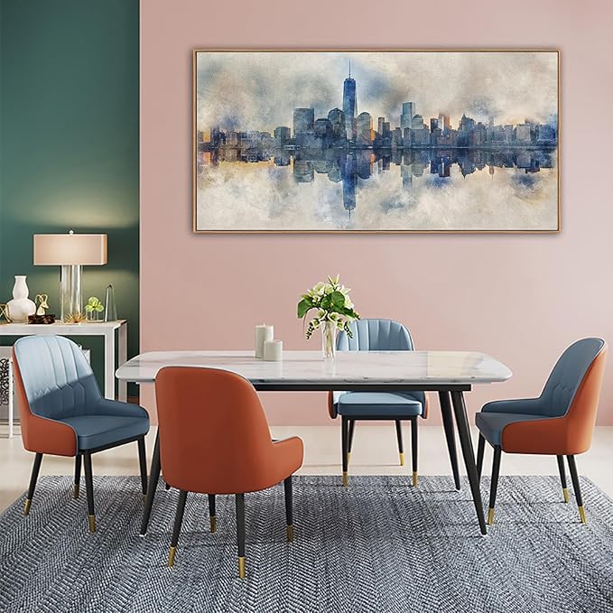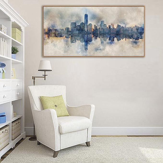 arteWOODS Framed Canvas Wall Art - Abstract New York City Painting Wall Decor Indigo Blue Gray Panoramic Art Print Skyline Reflection Pictures Artwork City Landscape Living Room Bedroom 29" x 58"