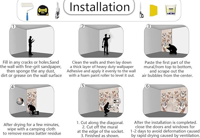 - Installation Steps1. Fill in any cracks or holes and clean the surface of the wall of dust, dirt and grease.2. Apply heavy-duty wallpaper paste to the wall, not the mural.3. Mark the position of each strip of wallpaper with a spirit level.4. Align the pattern and slide it into place.5. Scrape the bubbles with a spatula.6. Let it dry for a couple of minutes and it's ready to go!