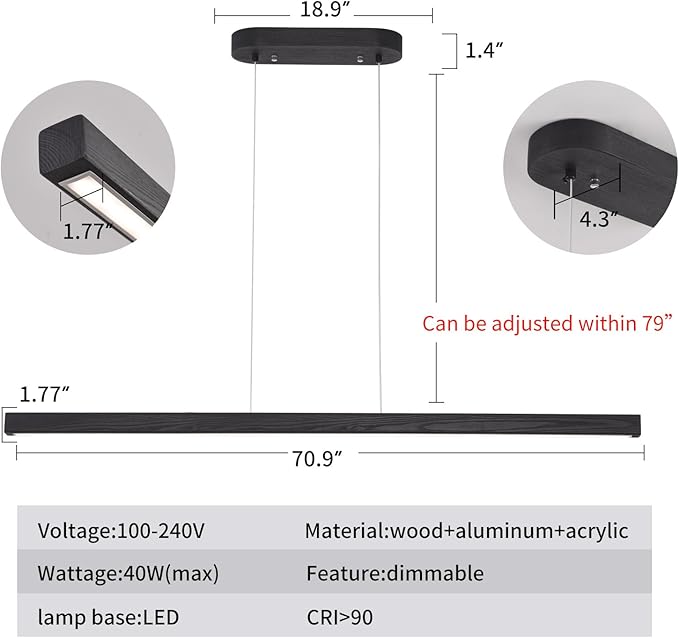 - 【Black Linear Pendant Dinning Room Light】This wood LED linear light is sleek and sophisticated with its matte black finsh. Dimensions: lamp body:71 x 1.7 x 1.7 inches(l*w*h). the mounting part:18.9 x 4.4 x 1.4 inches(l*w*h) can cover native American electrical box.the the cable length is adjustable up to 78 inches.notice:please do not use dimming switch, dimming equipment has been configured inside the light, please use ordinary wall button switch. otherwise the light fixture may flicker.