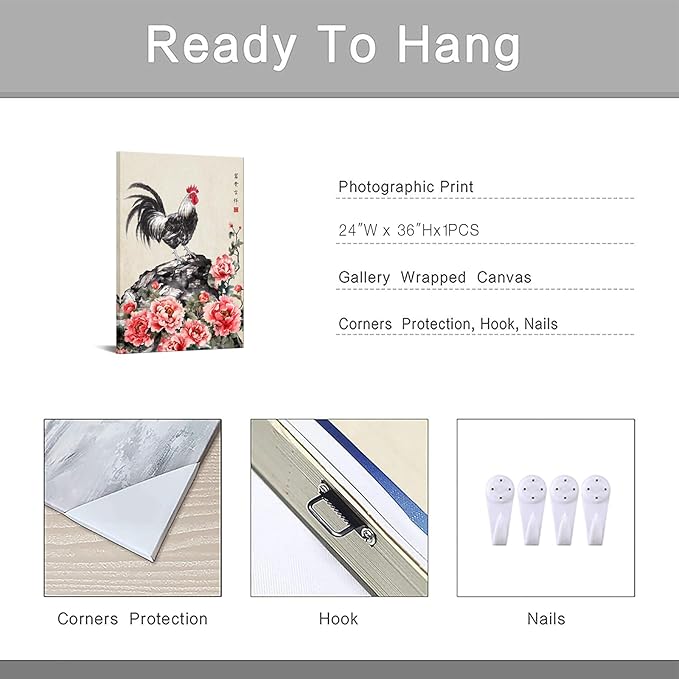 Canvbay Traditional Chinese Wall Art Rooster and Peony Floral Ink Painting on Canvas Framed Oriental Decor for Living Room Study 24x36 Inch
