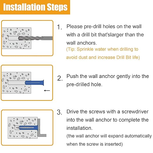 - CONVENIENT INSTALLATION – This masonry anchors and screws kit comes with drill bits that fit. Before installing the concrete screws, please drill holes on the wall, then insert the drywall anchors and slightly knock them into the wall until the surface is flat, after that, you can screw in the screws, done.