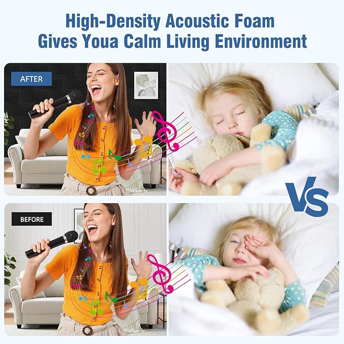 - 【Professional Sound Absorption】Our premium soundproof foam panels effectively dampen and diffuse low-frequency sound waves, improving sound clarity and minimizing interference, making them ideal for use in acoustic studios, recording rooms, control rooms, and similar environments.