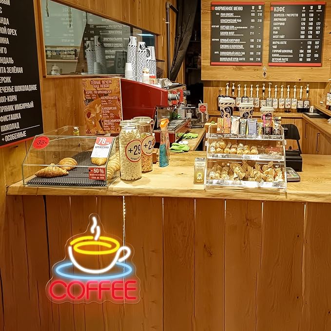 - Eye-Catching Fashion - Coffee neon sign is a unique store decoration sign, unique and beautiful decoration makes your coffee shop stand out in the whole community. A bright and uniform coffee bar sign will impress your guests.