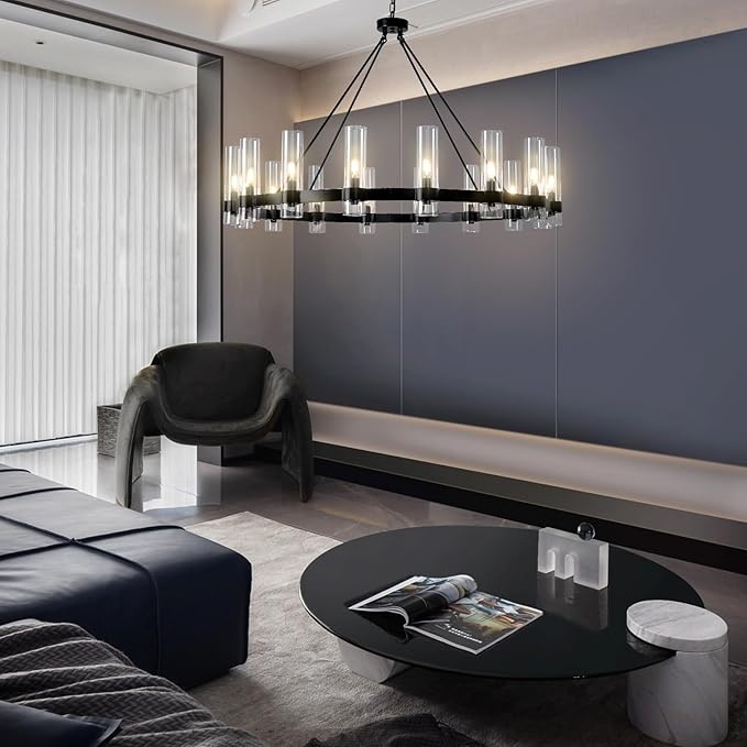 - Classic Black Wagon Wheel Chandelier: The large wagon wheel chandelier is made of high-quality black-plated stainless steel metal. Each part of the lamp body is precisely cut by machinery. The glass lampshade, fixed on the metal frame, is safe and sturdy; The 48 inch wagon wheel chandelier black has 16 E12 bulbs provide full 360° lighting, which is well integrated into your home decoration style and easily creates an elegant and comfortable home atmosphere.