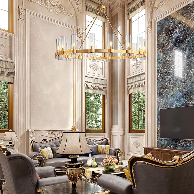 - Classic Gold Wagon Wheel Chandelier: The large wagon wheel chandelier is made of high-quality black-plated stainless steel metal. Each part of the lamp body is precisely cut by machinery. The glass lampshade, fixed on the metal frame, is safe and sturdy; The 48 inch wagon wheel chandelier gold has 16 E12 bulbs provide full 360° lighting, which is well integrated into your home decoration style and easily creates an elegant and comfortable home atmosphere