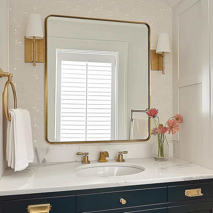 - Unique Design: Upgrade your space with the stunning brushed gold metal frame of our contemporary rounded rectangle mirror. Measuring 3/8 inch in width and 1 inch in depth, its beauty brushed brass color is unmatched by any other bathroom vanity mirror