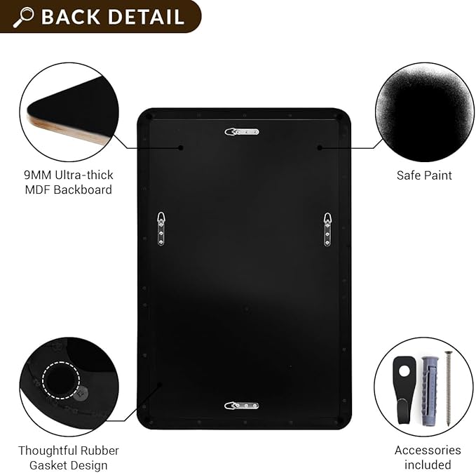 - Premium Quality: Our rustproof mirror is made with premium metal framing and 4mm HD glass, supported by a 9mm MDF backboard for shatterproof protection. The plate glass mirror floats in a thin 1/17" gap with a rounded corner design to soften your space