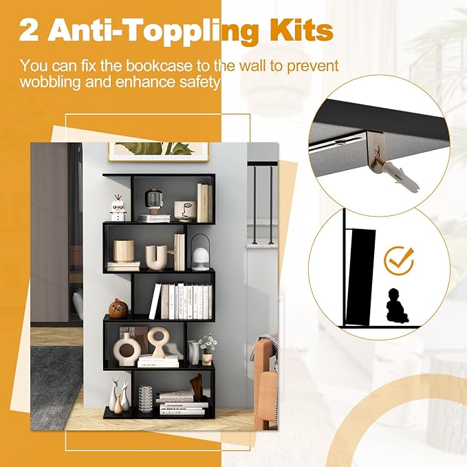 - S Shaped Bookshelf: Elevate your room with this unique 5-shelf bookcase featuring staggered cubes for a modern touch. Use it as a room divider, display shelf, cube organizer, or home accent to add a distinctive style to any space.