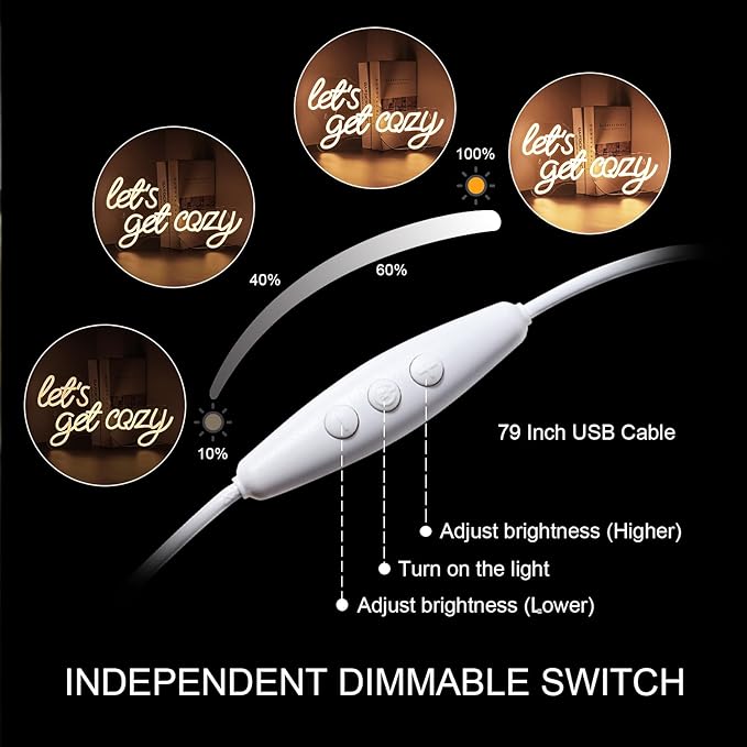 - Easy Installation:Experience hassle-free setup with our 'Let's Get Cozy' neon sign for wall decor. With included mounting hardware and easy-to-follow instructions, hanging or mounting your sign is a breeze. Simply choose the perfect spot, plug it in, and watch as it transforms your space into a haven of comfort and relaxation in no time.