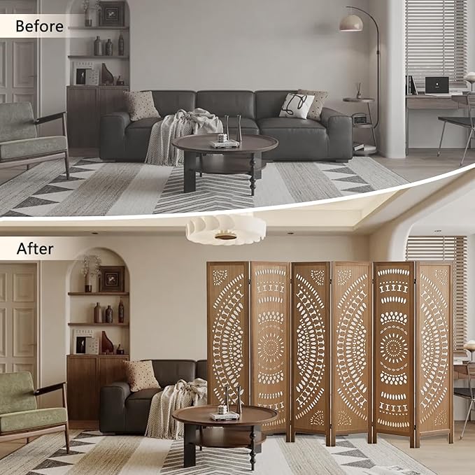 - Beautifully Carved Boho Style – This carved wooden room divider features a beautiful bohemian design, adding a decorative touch to any space while providing privacy. The pattern is precisely cut, wear-resistant, waterproof, and easy to clean, combining practicality with style. Perfect for living rooms, offices, and apartments.