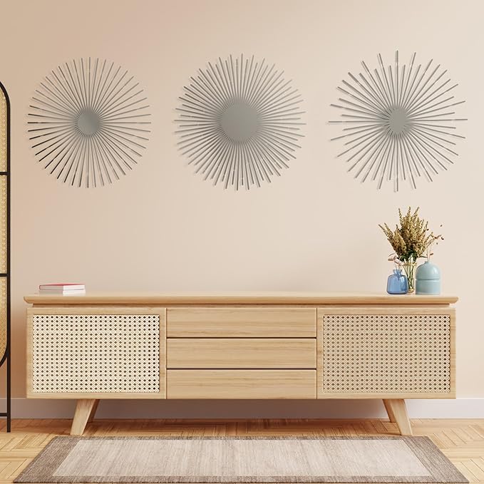NEODECO Sun Rays-Triple Metal Wall Art, Geometric Sun Decor, Metallic colors, Large 3D wall sculpture, model BCD, Set of 3 (Silver, Medium)