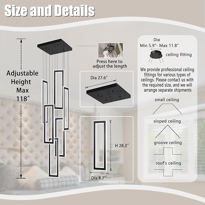 - 【Led Chandelier 6 Rings Chandelier Size】:The pendant light features a black circular ceiling pan with a diameter of 27.6 inches. The lamp body size is H 28.3"X W 8.7",The pendant light has an adjustable cord and a total length of 118 inches, allowing you to choose the suitable height for your space