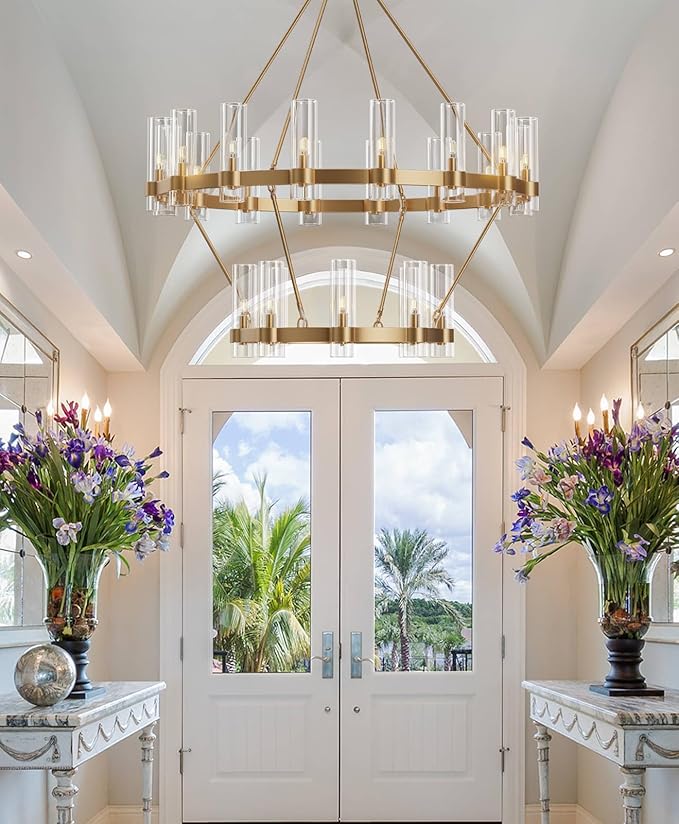 48" Gold Chandelier, 2 Tier Wagon Wheel Chandelier with Glass Shade, 24-Lights Large Round Modern Farmhouse High Ceilings Pendant Lighting Fixture for Dining Room, Living Room, Kitchen, Foyer