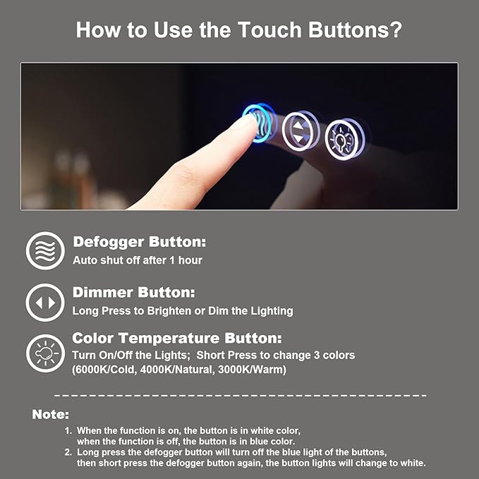 - 【Smart Defogging System】With defogger function, our led bathroom mirrors can quickly remove the water vapor on the mirror surface and maintain a clear and transparent state. No need to wipe the mirror after bathing. When the function is on, the button is in white color, and it's in blue color when the function is off. The defogger will be automatically shut off after 1 hours of being on.