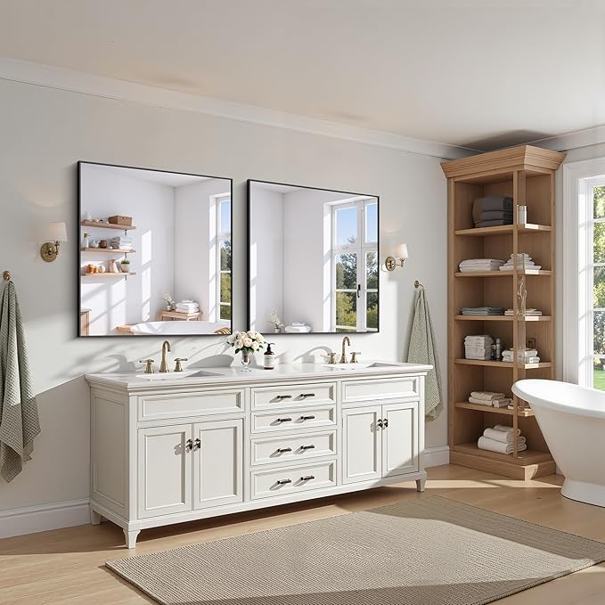 - MODERN DESIGN : KOCUUY 36x36 black vanity mirror is with innovative design which gives the wall mirror a more fashion feel. With a classic square corner, the wall mounted mirror allows for creativity and functionality in bathroom, bedroom, entryway and anywhere else. Let your living space be an expression of your personal style, not limited to modern or contemporary, farmhouse or industrial