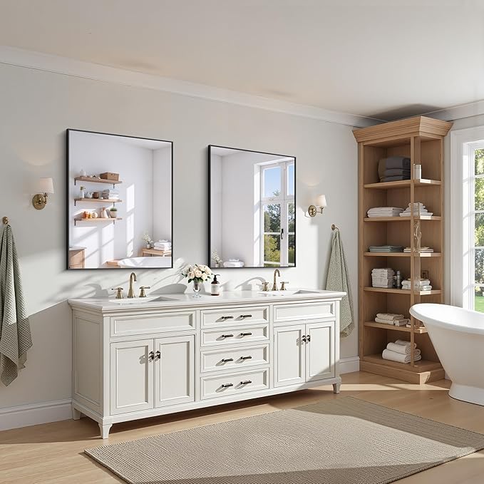 - MODERN DESIGN : KOCUUY 30x36 black vanity mirror is with innovative design which gives the wall mirror a more fashion feel. With a classic square corner, the wall mounted mirror allows for creativity and functionality in bathroom, bedroom, entryway and anywhere else. Let your living space be an expression of your personal style, not limited to modern or contemporary, farmhouse or industrial