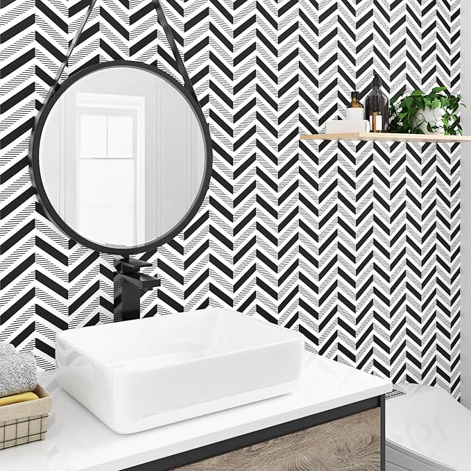 Black and White Peel and Stick Wallpaper Herringbone Geometric Wallpaper Modern Boho Geometric Contact Paper Self Adhesive for Bedroom Living Room Accent Wall Cabinets Drawers 17.5" x120"