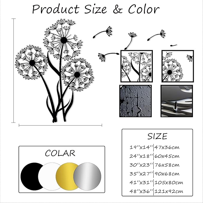 - ●Artistic Beauty and Personality Display: This metal dandelion wall decor, with its minimalist and modern design, adds a touch of unique artistic flavor to the home space. The combination of exquisite craftsmanship and metal material gives it a serene and classic artistic temperament, which not only attracts your attention but also highlights your unique taste
