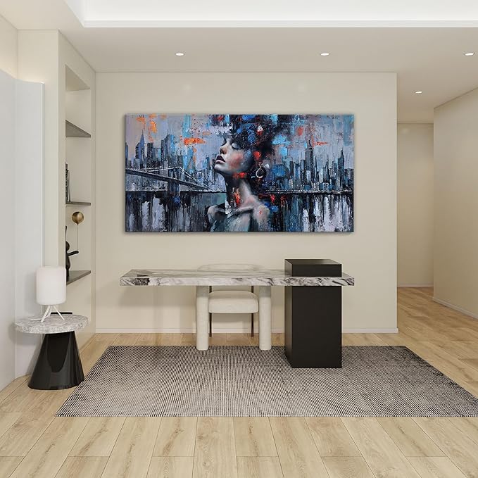 Navy Blue Abstract Wall Art Woman Picture for Living Room Modern Home Bedroom Decoration New York City Framed Cityscape Artwork Decor 29x58IN