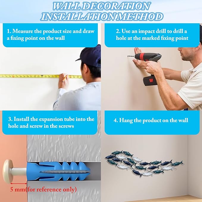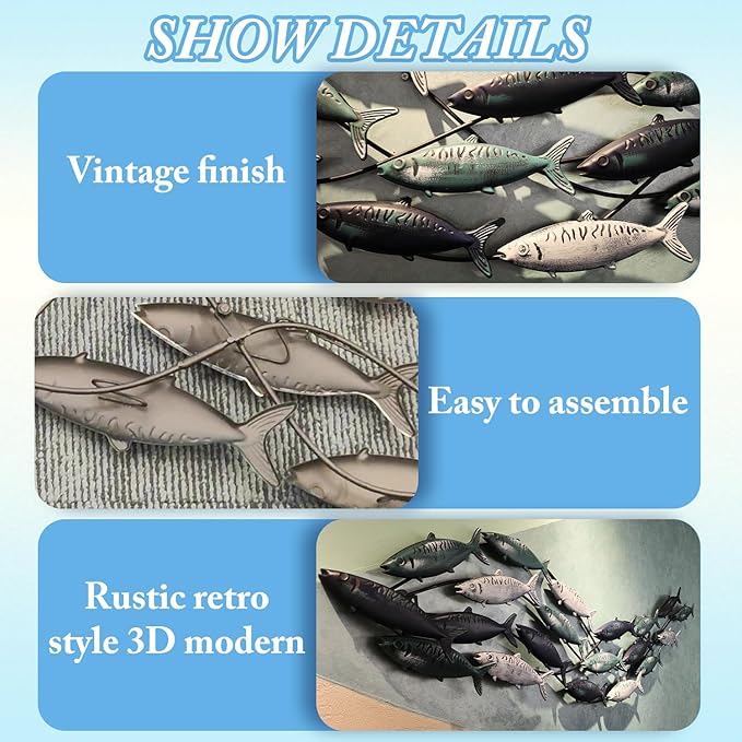 - Metal Fish Wall Decor : 20 lifelike fish frolicking in the water, handmade metal iron crafts, Hand painted old-fashioned fish decoration with a Mediterranean-style marine theme, Smart and elegant, lifelike, retro distressed finish. Large Size 59" x 16"(150 x 40cm).