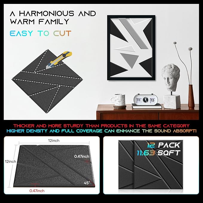 12 Pack Self-Adhesive Soundproof Wall Panels, 12 x 12 x 0.47 in Sound Proof Foam Panels for Walls, 1.2lb/ft³ High Density, Thicker 0.47in, Acoustic Panels, Noise Dampening Panels Studio Black