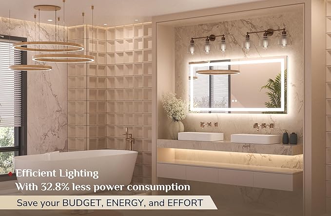 - 【Save More with Efficient Lighting】 Experience top-tier illumination while saving energy with our energy saving frontlit & backlit mirror. With a remarkable 32.8% reduction in power consumption, this LED mirror for bathroom is designed to cut down on your energy costs without compromising brightness.