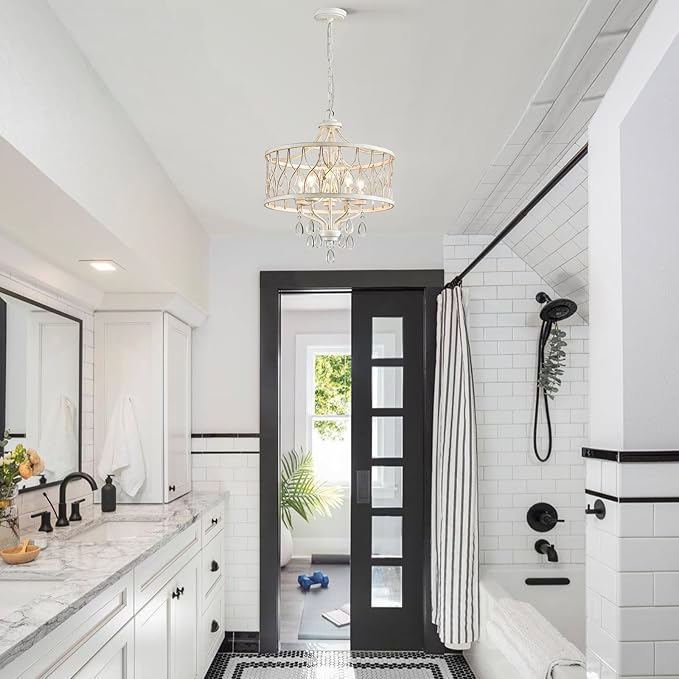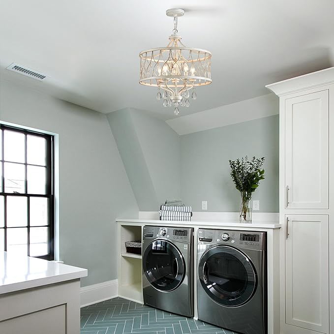 Modern Crystal Chandelier, 5-Light Farmhouse White Chandelier for Dining Room Vintage Hanging Pendant Light Fixtures Round Chandelier for Kitchen Island Entryway Foyer Bedroom Office Bar