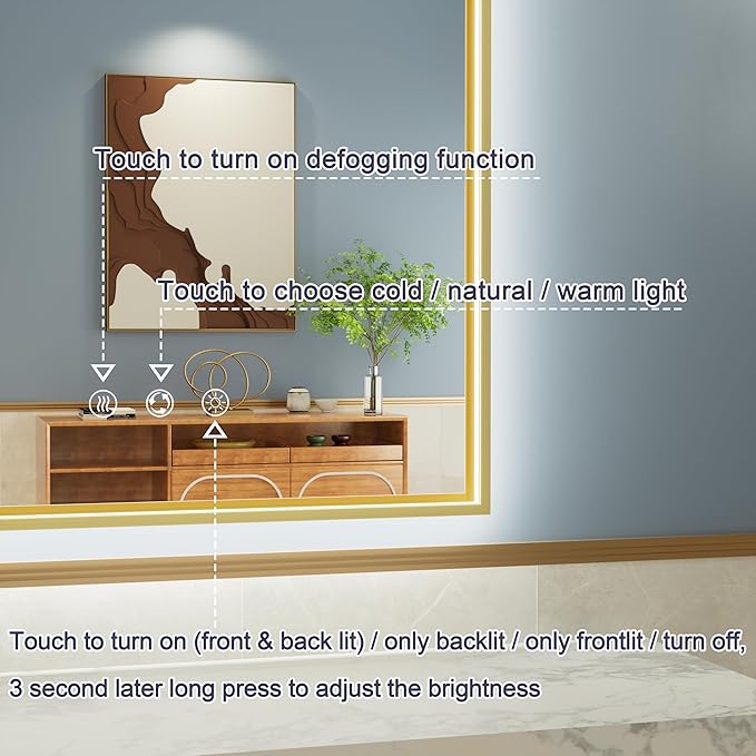 - [Dual LED Strip and Gold Aluminum Frame] JSneijder LED bathroom mirror with built-in front and back dual LED strip for brighter display; Short press the light button to set the front / back / front & back lights; The brushed gold aluminum frame surrounding makes the mirror more delicate