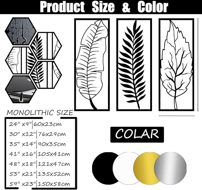 - Perfect Decor: If you want a nature vibe indoors and like to incorporate metallic textures into your decor, then this metallic palm leaf wall decor is the perfect choice for you. It combines the natural beauty of palm leaves with the elegance of metal, making it a visually striking focal point in any room.