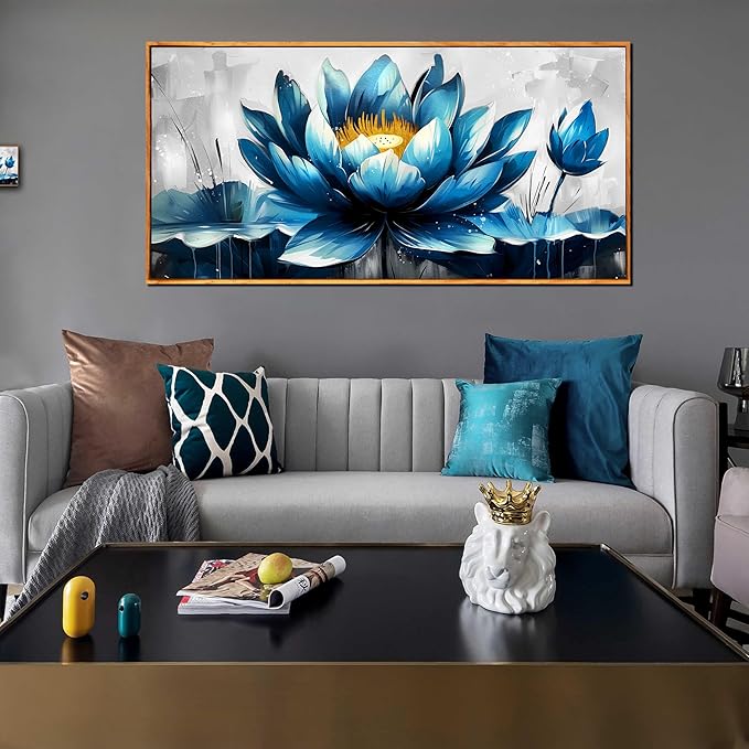 Ouzzlie Large Flower Wall Decor Blue Wall Art for Living Room Gold Art Lotus Posters for Home Office 29" x 59"